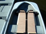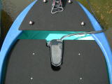 縦100・横385・高さ185mmの一般的な発砲ブロックがデッキ前方にピッタリ合う様に加工して有ります。(ボート船底部に水捌け様の溝や窪みが有るので、市販の発砲ブロックを使う場合は、多少の加工が必要に成る場合も有ります。)※浮力帯の上に挟む様にセットした時にデッキが丁度良く成る様に成って降ります。14ftスナガボートをお使いに成る時は、この様にセットして下さい。