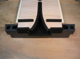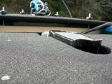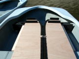 次にデッキ前方のウイング部と本体の溝に合う様に発砲ブロックをセットします。後はウイングを開いてセット完了です。(ボートに寄っては、ガンネルの下に入り込む様に成りますので、デッキを浮力帯のやや後ろに置いて発砲ブロックにセットしてから、滑り込ます様にセットするか、ガンネルの下に片方のウイングをずらして入れ込んでから両方のウイングを開き丁度良い位置にずらして下さい。)※出来る限りボートとの隙間が出ない様に製作していますので御了承下さい。